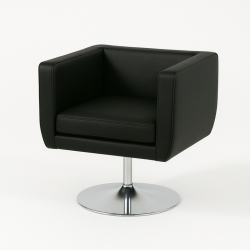 Czarny fotel obrotowy z ekoskóry z chromowaną podstawą. Regulowana wysokość siedziska. Wymiary: wys. 68-80 cm, wys. siedziska 43-55 cm, siedzisko 63×56 cm, zewnętrzne wymiary fotela 40x64x50 cm. Idealny na scenę, konferencje, prezentacje, gale oraz eventy firmowe.