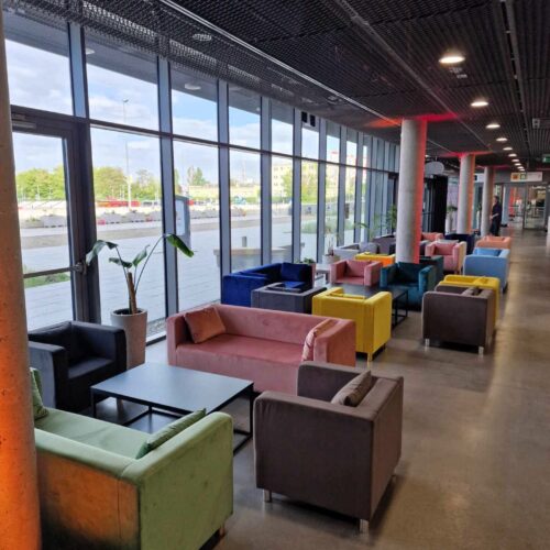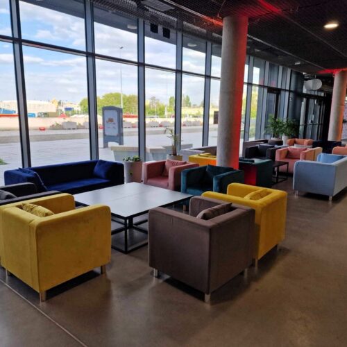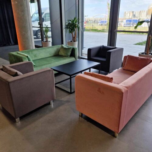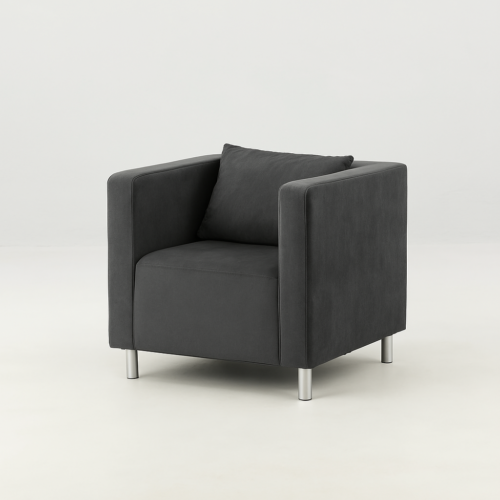 Stylowy fotel z miękkiej, welurowej tkaniny Velvet w kolorze grafitowym. Wymiary: wysokość 67 cm, szerokość 72 cm, głębokość 70 cm. Smukłe nóżki w kolorze złotym lub srebrnym. W zestawie dodatkowa poduszka. Dedykowany do użytku wewnątrz. Minimalistyczny design pasujący do stylu glamour, klasycznego i industrialnego. Wynajem z transportem i montażem.