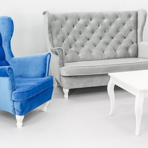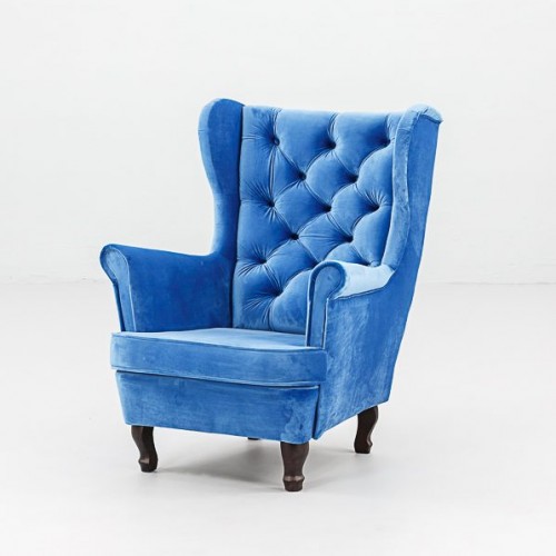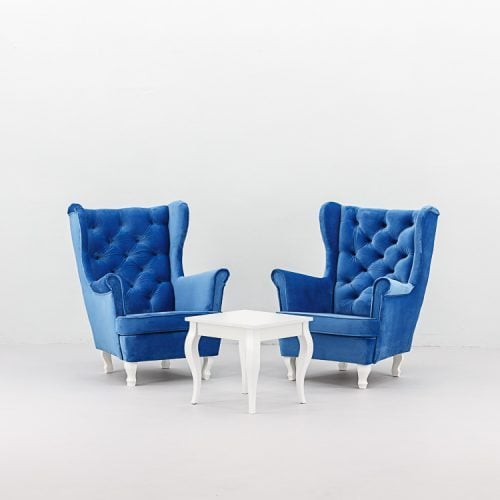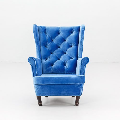 Elegancki fotel Hampton Blue z aksamitną, niebieską tkaniną premium, klasyczną pikowaną formą, dekoracyjnymi guzikami, wysokimi podłokietnikami i głębokim siedziskiem. Idealny na ekskluzywne eventy i eleganckie wnętrza. Wysokie, czarne drewniane nóżki, na życzenie wersja z białymi. Wymiary: głębokość 85 cm, szerokość 75 cm, wysokość 104 cm, wysokość siedziska 43 cm. Dostępność 10 sztuk. Wynajem realizowany wyłącznie z transportem.