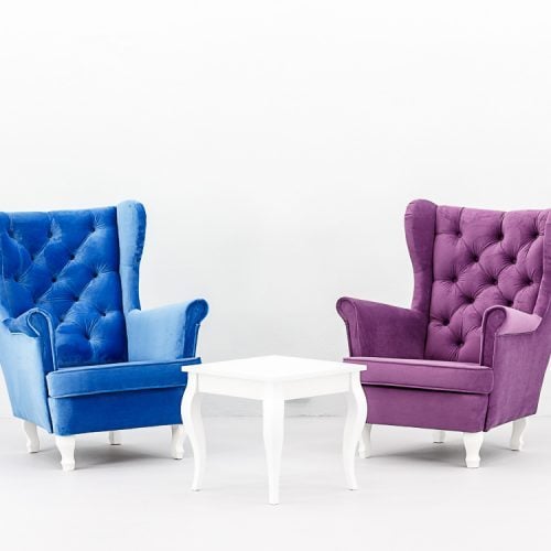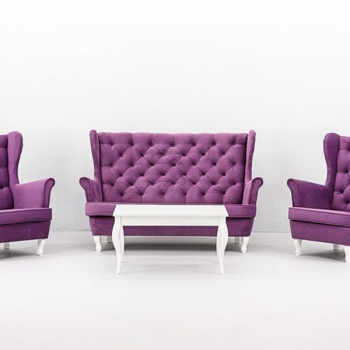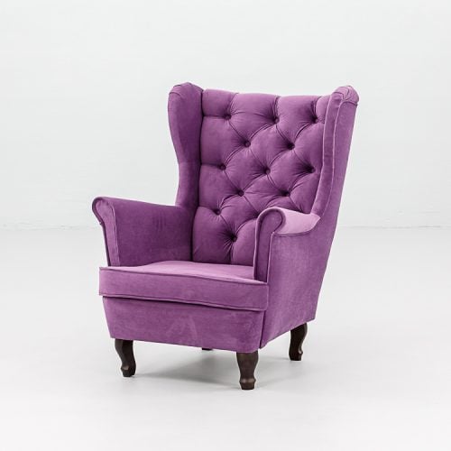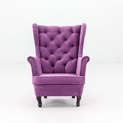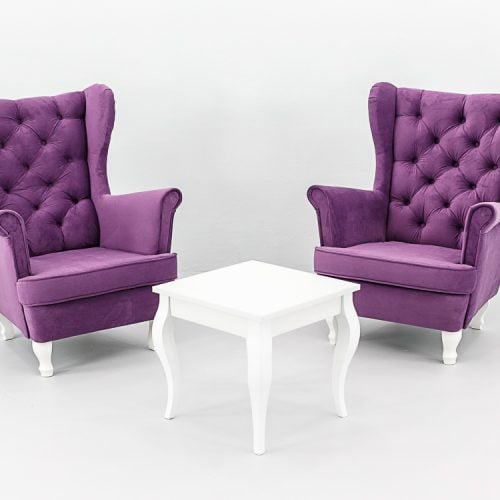 Elegancki fotel Hampton Violet tapicerowany aksamitną tkaniną w głębokim odcieniu fioletu. Pikowane oparcie z dekoracyjnymi guzikami, wysokie podłokietniki i ergonomiczne siedzisko zapewniają komfort. Wykonany z tkaniny premium. Wysokość 104 cm, szerokość 75 cm, głębokość 85 cm. Dostępność: 10 sztuk. Wynajem wyłącznie z transportem.