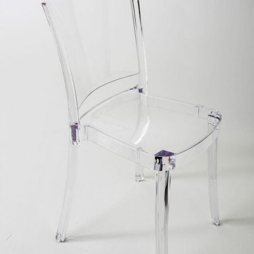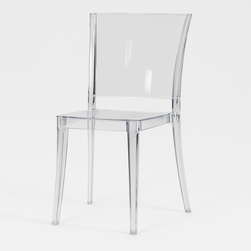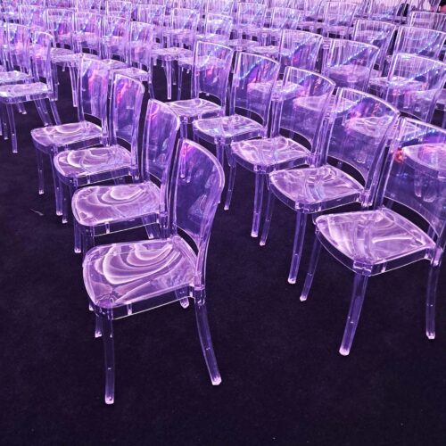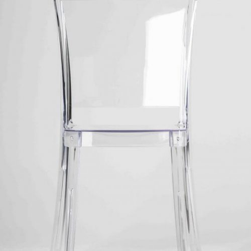 Transparentne, przezroczyste krzesło wykonane z poliwęglanu, idealne na wesela, gale, bankiety i konferencje. Wymiary: wysokość 85,3 cm, szerokość 49,4 cm, głębokość 50 cm. Dostępność 300 sztuk. Przeznaczone do użytku wewnątrz i na zewnątrz.