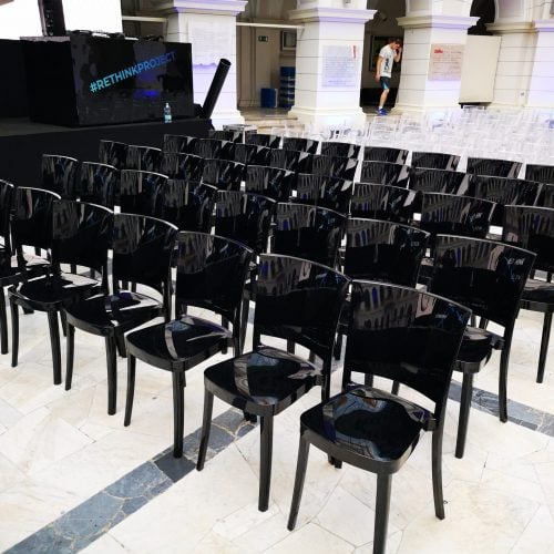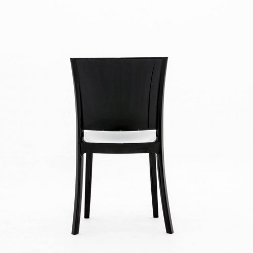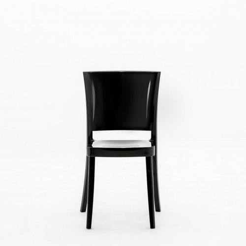 Piękne i unikatowe krzesło wykonane z czarnego poliwęglanu o wysokim połysku. Idealne na prestiżowe eventy, gale, eleganckie przyjęcia, śluby, wesela, konferencje, targi, pokazy mody i biznesowe spotkania. Wysokość 85,3 cm, szerokość 49,4 cm, głębokość 50 cm. Wewnątrz. Wyprodukowane we włoskiej Bolonii na specjalne zamówienie wypożyczalni Eventomat. Usługa wynajmu obejmuje transport i montaż.