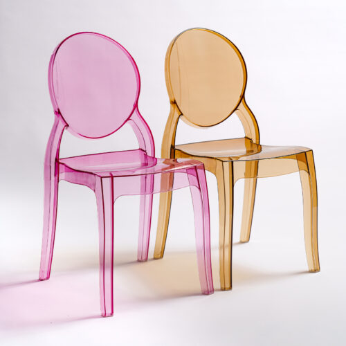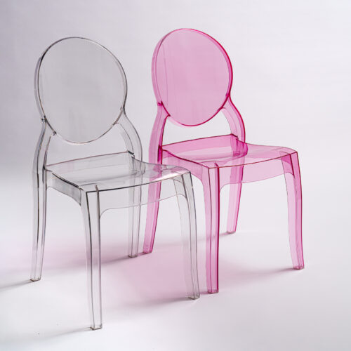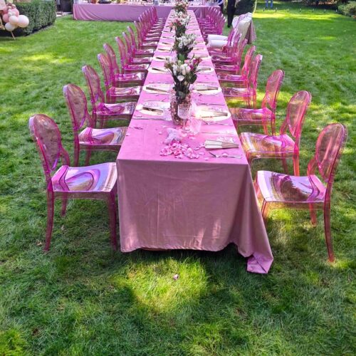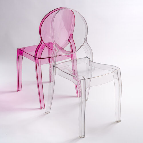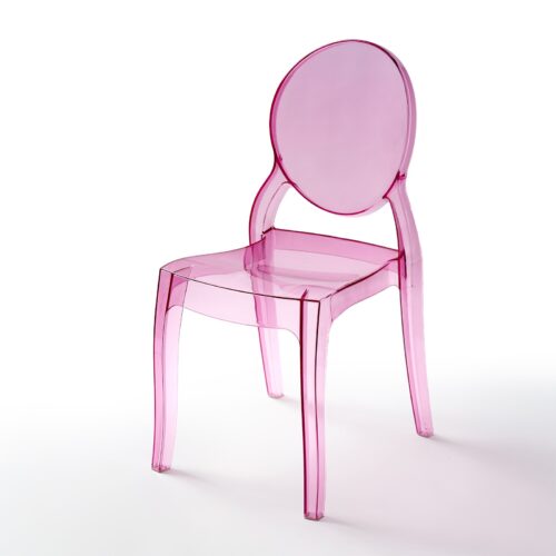 Przezroczyste różowe krzesło eventowe Queen Rose wykonane z poliwęglanu, wymiary: wys. 89,5 cm, szer. 47 cm, głębokość 50 cm, 100 szt. dostępnych. Ergonomiczny kształt, trwała konstrukcja, nadaje się do użytku wewnątrz i na zewnątrz. Idealne na wesela, pokazy mody, targi beauty oraz inne wydarzenia. Wypożyczenie dostępne wyłącznie z transportem.