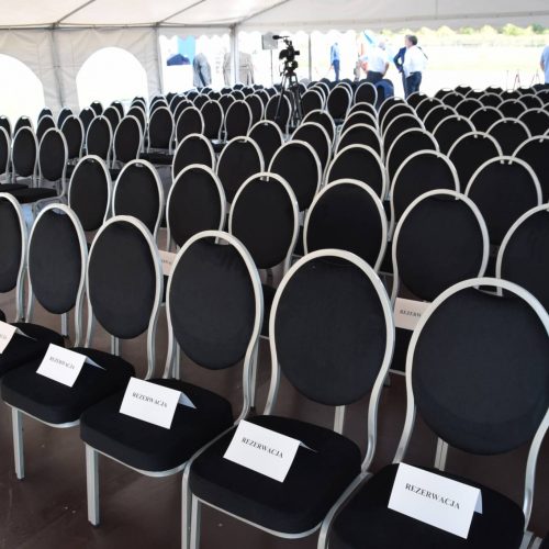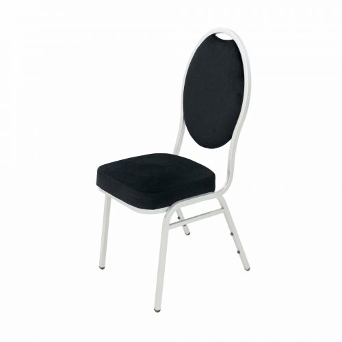 Wyjątkowo eleganckie, tapicerowane krzesło z srebrnym metalicznym stelażem i czarną welurową tapicerką, idealne na konferencje, bankiety, śluby, wesela, uroczystości rodzinne oraz targi. Wymiary: Wysokość 87,5 cm, Szerokość 44,7 cm, Głębokość 60 cm. Dostępność: 200 sztuk.