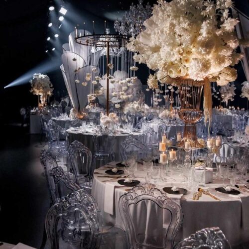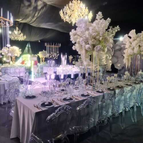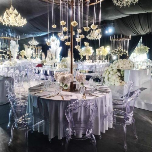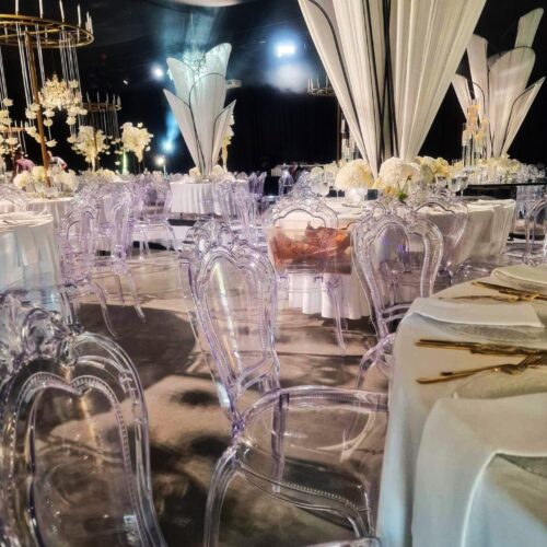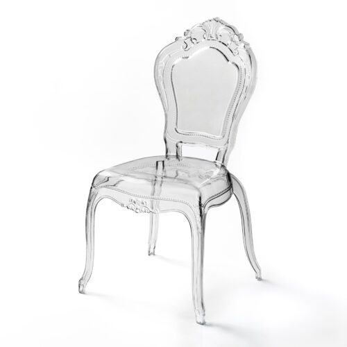 Eleganckie przezroczyste krzesło wykonane z trwałego poliwęglanu, o finezyjnie zdobionej formie. Wymiary: Głębokość 47,5 cm, Szerokość 47 cm, Wysokość 97 cm, Wysokość siedziska 48,5 cm. Przeznaczone do użytku wewnątrz i na zewnątrz. Idealne na prestiżowe eventy, gale, uroczystości, śluby, wesela, konferencje, targi i pokazy mody. Wynajem z profesjonalnym transportem i montażem.