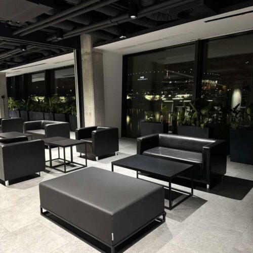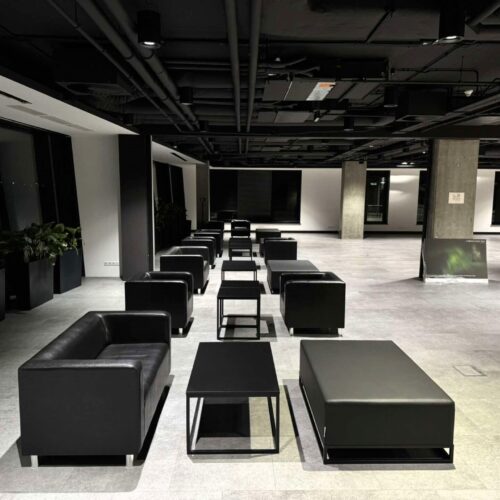 Pufa Loft Black to mebel w industrialnym stylu z ekoskóry i stali malowanej proszkowo. Wymiary: 44 cm wysokości, 120 cm szerokości, 80 cm głębokości. Przeznaczona do użytku wewnątrz i na zewnątrz. Dostępna w 12 sztukach, oferowana w 9 kolorach. Idealna na eventy takie jak konferencje, bankiety czy przyjęcia.