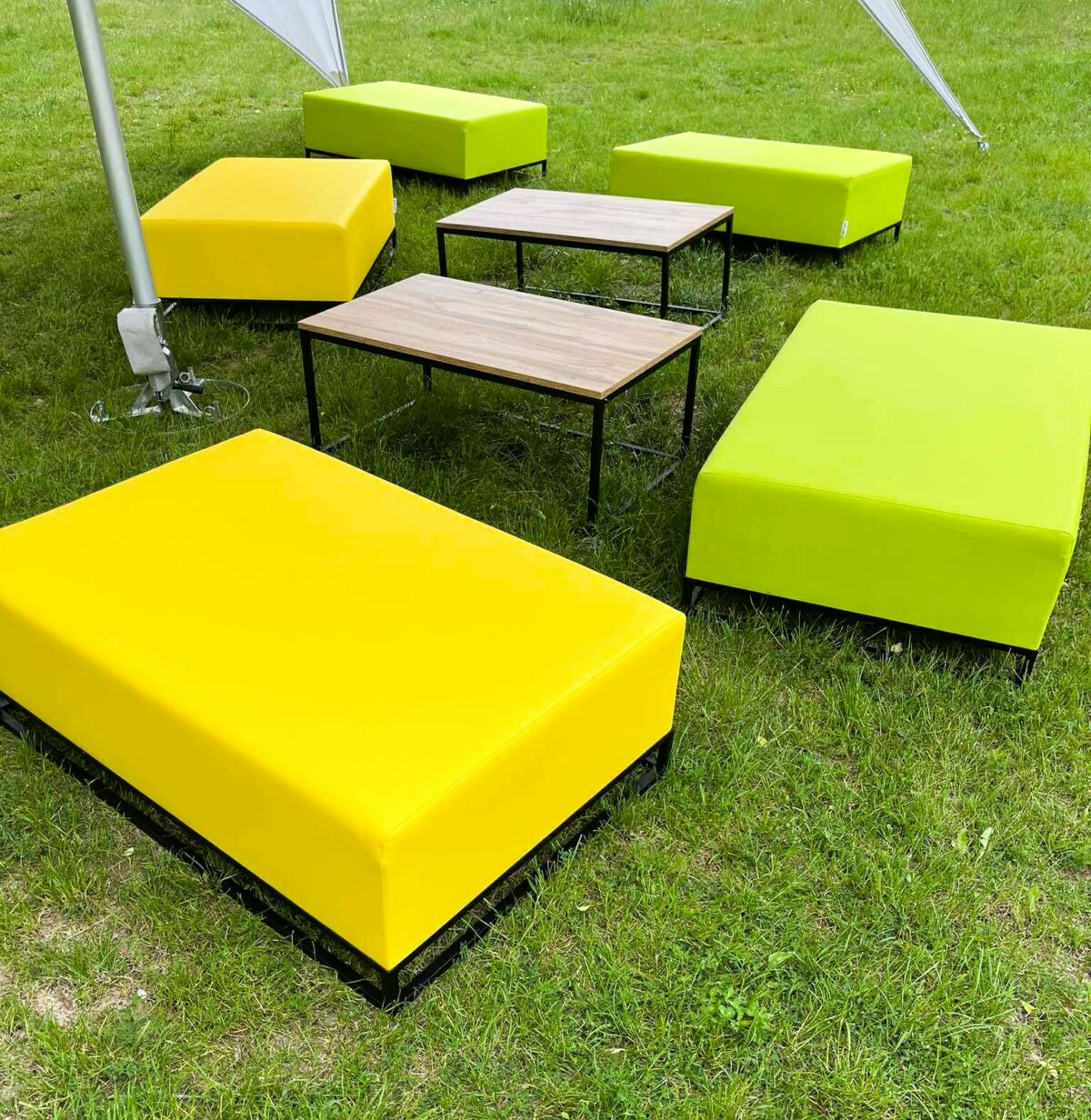 Pufa Loft Yellow w promiennym, słonecznym odcieniu żółci, idealna na letnie imprezy, warsztaty, wesela i eventy firmowe. Wygodne siedzisko i dekoracyjny element. Wymiary: wys. 44 cm, szer. 120 cm, głęb. 80 cm. Kolor: żółty, czarny. Wykończenie: ekoskóra thick, stal malowana proszkowo. Dostępność: 12 sztuk. Przeznaczona do użytku wewnątrz i na zewnątrz. Wynajem realizowany wyłącznie z transportem.