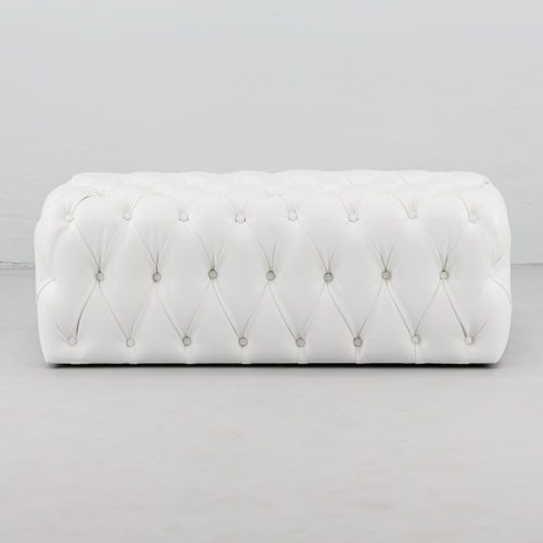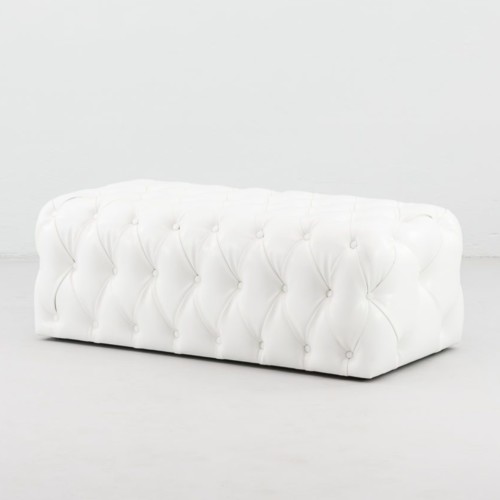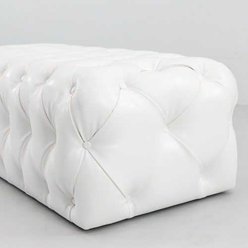 Pufa GLAMOUR WHITE to elegancka pufa z ekoskóry premium w białym kolorze, pikowana w stylu Chesterfield. Może pełnić funkcję siedziska, podnóżka lub stolika pomocniczego. Wymiary: 60 cm głębokości, 120 cm szerokości, 45 cm wysokości. Produkt wycofany z oferty. Dostępna również w kolorze czarnym. Wynajem realizowany wyłącznie z transportem.