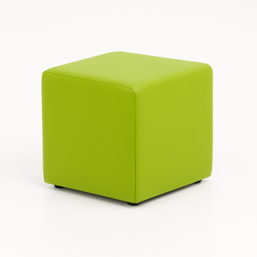 Minimalistyczna pufa w kolorze limonkowo-zielonym, wykonana z ekoskóry thick, o wymiarach 40x40x40 cm, przeznaczona do użytku wewnątrz i na zewnątrz. Idealna do aranżacji z ograniczoną przestrzenią na konferencje, pikniki i strefy chillout.