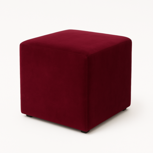 Elegancka pufa w kolorze głębokiego burgundu, tapicerowana miękkim welurem, o wymiarach 45x45x45 cm. Doskonała na wydarzenia indoorowe, takie jak konferencje, bankiety, targi, strefy VIP i backstage. Minimalistyczna forma sześcianu, wykończenie z tkaniny premium. Wynajem wyłącznie z transportem.