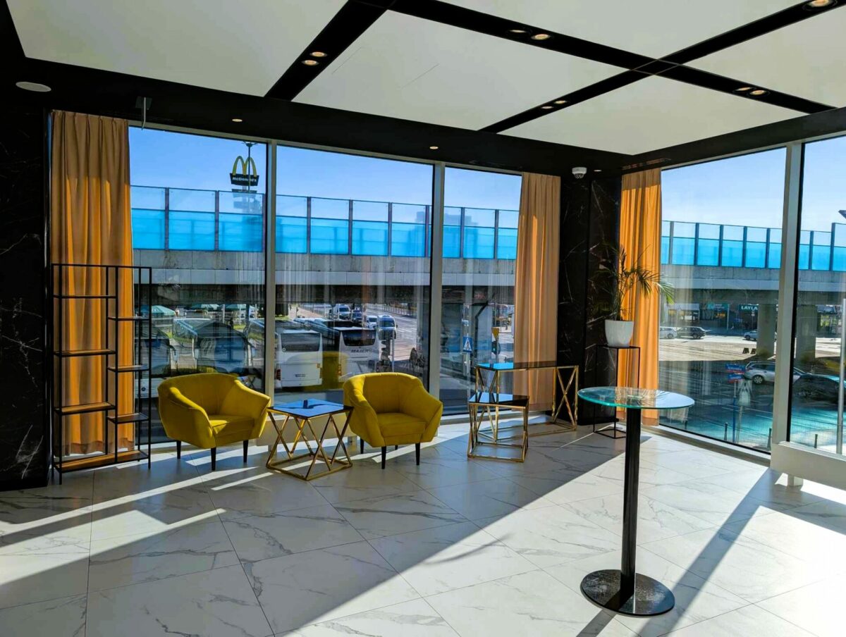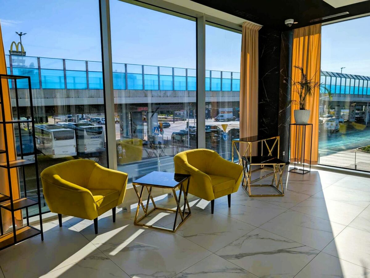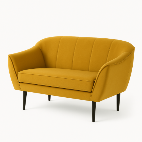 Sofa Como Goldy o wymiarach 75 cm wysokości, 140 cm szerokości i 74 cm głębokości. Musztardowo-złoty odcień, miękka welurowa tkanina premium, subtelne pionowe przeszycia na oparciu i smukłe czarne nóżki z drewna. Przeznaczona do użytku wewnątrz, dostępna w liczbie 5 sztuk.