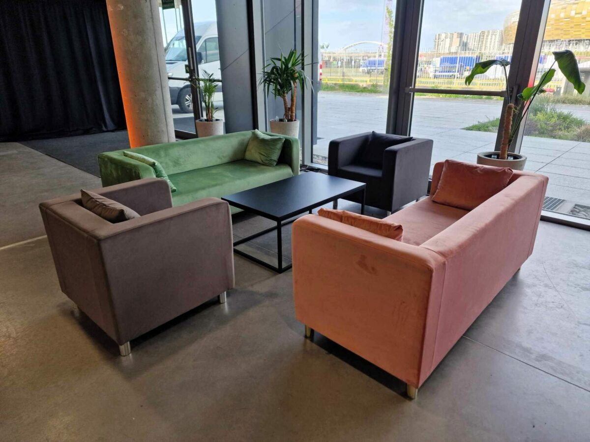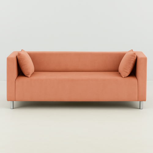 Stylowa sofa o wymiarach 67 cm wysokości, 172 cm szerokości i 70 cm głębokości, w kolorze brzoskwiniowym z tkaniny premium, przeznaczona do użytku wewnętrznego. Sofa posiada dwie miękkie poduszki oraz nóżki w wersji złotej lub srebrnej. Idealna na eventy, strefy chillout, przyjęcia i spotkania tematyczne.
