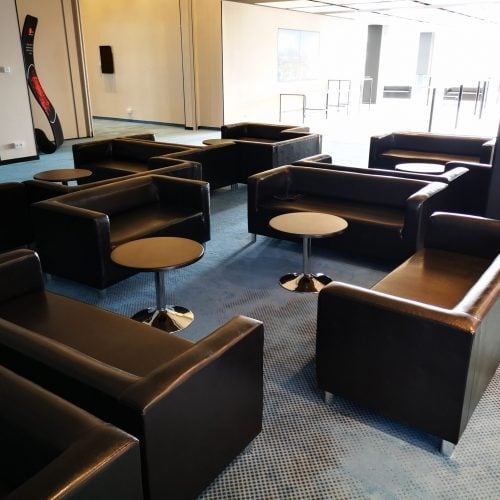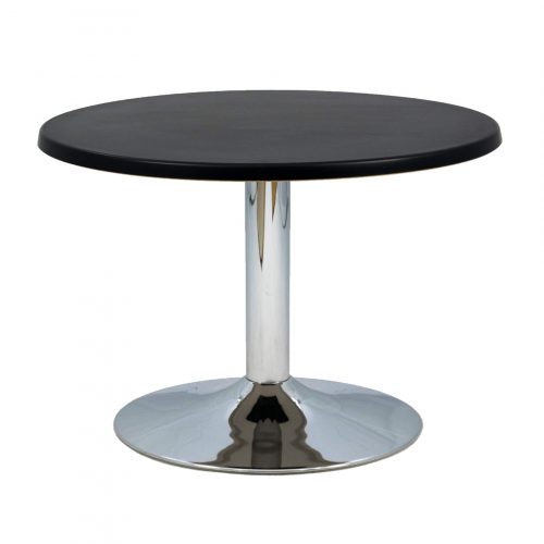 Elegancki stolik kawowy z blatem okrągłym o wysokości 50 cm, średnicy blatu 60 cm i średnicy podstawy 45 cm. Podstawa chromowana, blat czarny, wykonany ze stali chromowanej i drewna lakierowanego. Przeznaczony do użytku wewnątrz. Dostępność 20 sztuk.