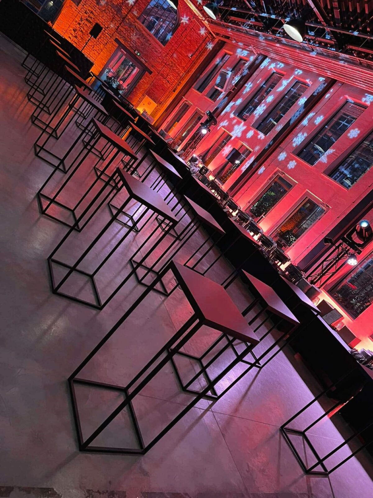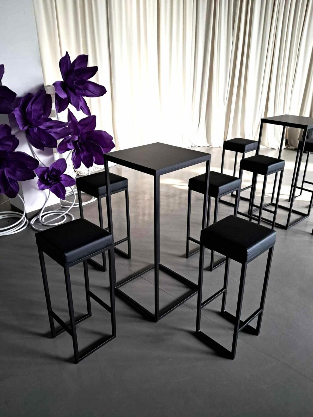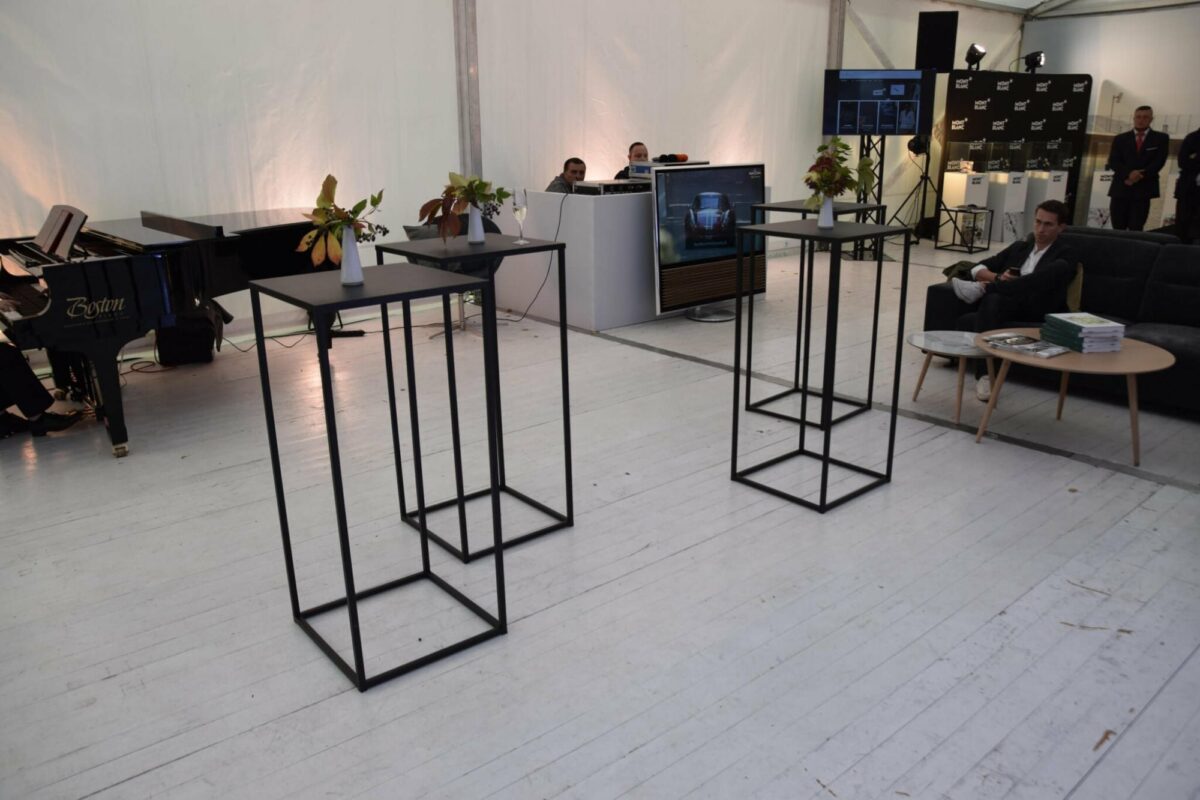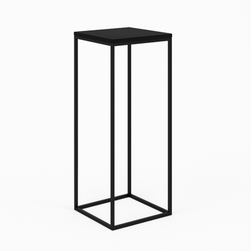 Elegancki stolik koktajlowy z wymiennym blatem: blat z płyty meblowej do wnętrz lub metalowy malowany proszkowo odporny na warunki atmosferyczne, wym. 110x50x50 cm, wykończenie ze stali malowanej proszkowo i płyty meblowej, dostępność 60 szt.