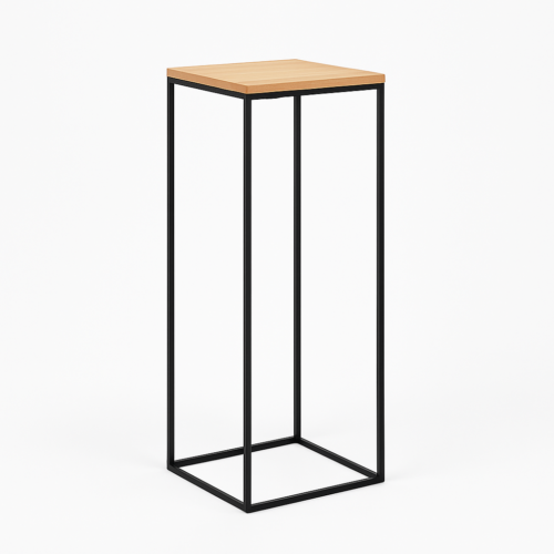 Stolik modnego połączenia stali z naturalnym drewnem bukowym, o wymiarach 110 cm wysokości, 50 cm szerokości i 50 cm głębokości. Stelaż malowany proszkowo na czarno. Przeznaczony do użytku wewnątrz. Dostępność 60 sztuk. Wynajem z transportem.