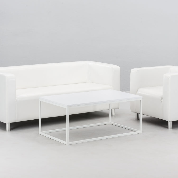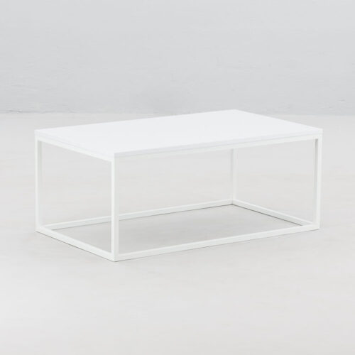 Stolik niskokawowy, biały, wykonany ze stali malowanej proszkowo oraz MDF. Wymiary: 42 cm wysokość, 100 cm szerokość, 60 cm głębokość. Przeznaczony do użytku wewnątrz, dostępność 30 sztuk. Kompatybilny ze wszystkimi sofami i fotelami, pasuje do nowoczesnych i industrialnych aranżacji.