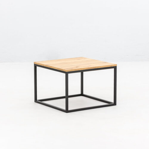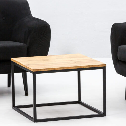Stolik niskiego typu kawowego, łączący stal malowaną proszkowo w kolorze czarnym z blatem MDF w kolorze dąb wotan. Wymiary: wysokość 42 cm, szerokość 60 cm, głębokość 60 cm. Przeznaczony do użytku wewnątrz, dostępność 20 sztuk. Idealny do nowoczesnej i industrialnej scenografii, kompatybilny ze wszystkimi sofami i fotelami.