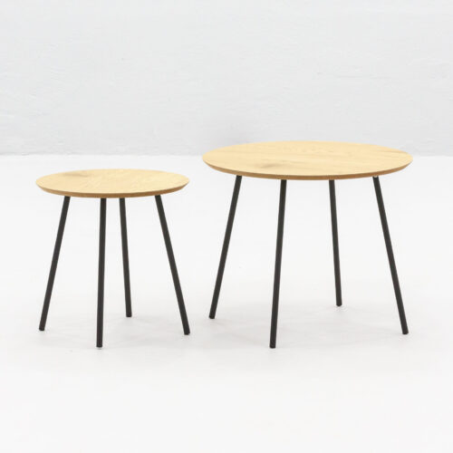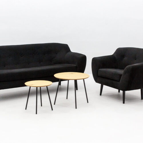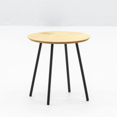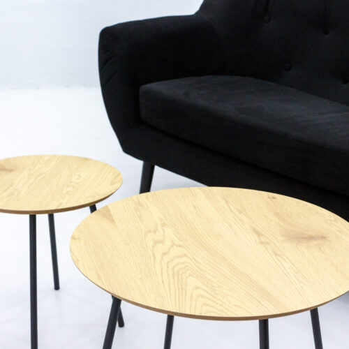 Stolik niskiego typu kawowego o wysokości 40 cm i średnicy blatu 40 cm. Wykonany z dębowego drewna, czarny kolor, z wykończeniem stal malowana proszkowo i MDF. Przeznaczony do użytku wewnątrz. Dostępnych 30 sztuk.
