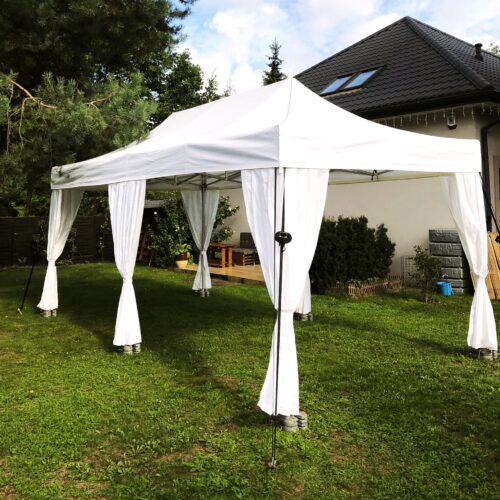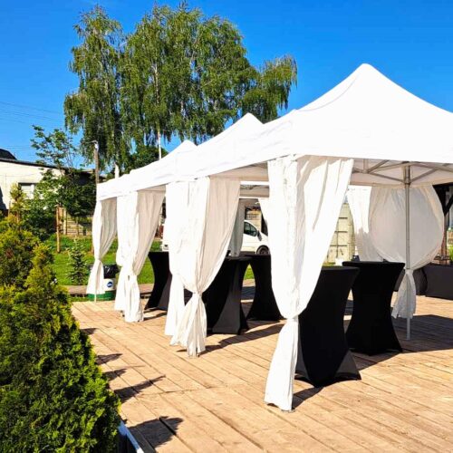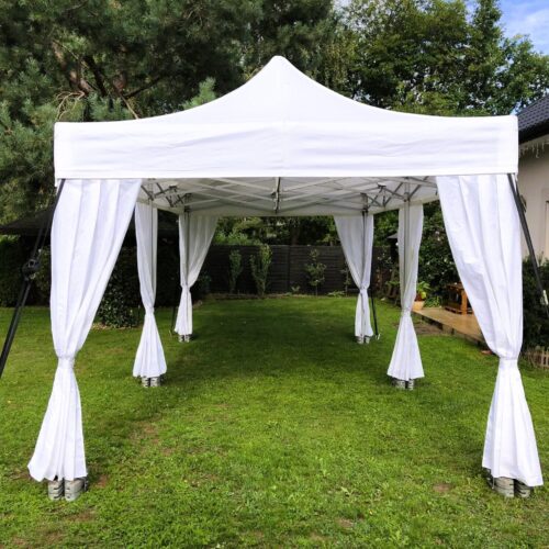 Namioty Mastertent Royal w różnych wymiarach od 3m x 3m do 5m x 5m, konstrukcja aluminiowa, wodoodporne i trudnopalne poszycie, eleganckie drapowane dekory. Idealne do uroczystych imprez plenerowych. Możliwość wyposażenia w podłogę, oświetlenie LED, ogrzewanie, meble.